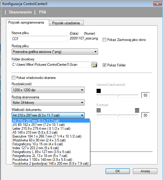 Poza tym można niezależnie ustawić rozdzielczość, format skanów, lokalizację zapisu na hdd niezależnie dla przycisków na drukarce jak i dla przycisków w programie ControlCenter3.