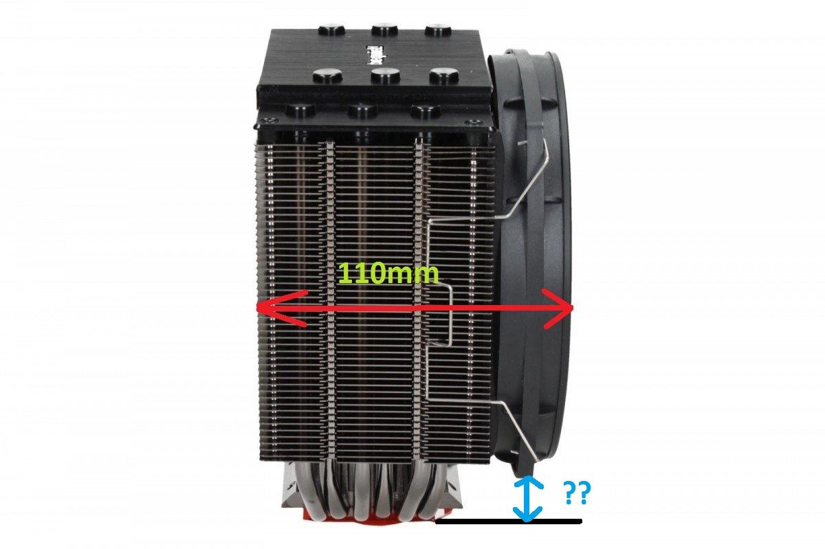 Moje chłodzenie to: https://www.morele.net/chlodzenie-cpu-raijintek-ereboss-0p105250-602806/ czyli naprawdę spory gabaryt. Procesor to Xeon 3,4 GHZ. Potrafi się grzać bez odpowiedniego chłodzenia. Obecny Raijintek świetnie go chłodzi, więc gdybym jednak zmieniał to muszę zakupić coś mniejszego niż on lecz tak samo (albo bardziej) wydajnego. No właśnie. Nie wiem jak te wymiary podają, bo wszędzie jest inaczej poopisywane, albo ja czegoś nie kumam. Moja max szerokość której teraz szukam to 110mm z wentylatorem. Dla pewności wstawiam obrazek o który dokładnie wymiar mi chodzi.