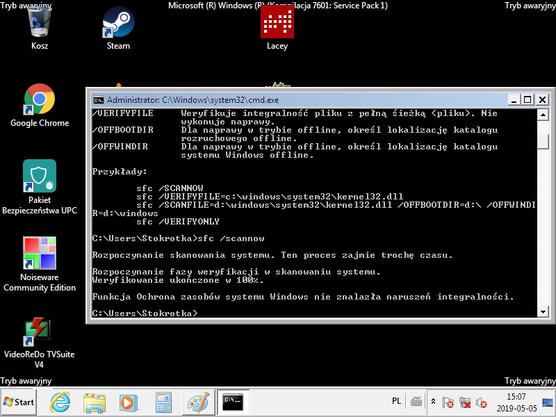 Nie mogę uruchomić cmd jako administrator, bo znowu pokazuje się, że Eksplorator Windows przestał działać, próbowałam też skrótów klawiszowych ctrl+shift+enter i też nic. Nie mogę więc wykonać sfc/scannow.