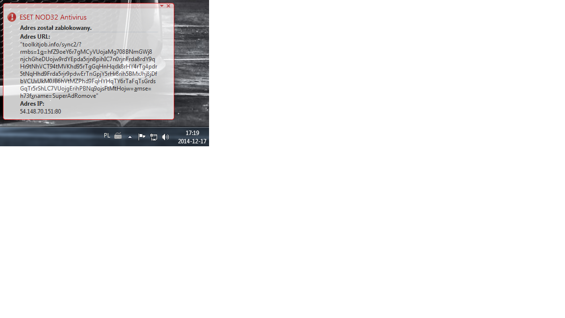 Witam, od paru dni co chwilę wyskakuje mi powiadomienie z ESET-a, że adres URL został zablokowany, żadne takie strony nie są włączone, nie próbuję na nie wchodzić, za każdym razem adres jest inny oprócz tego na końcu "SuperAdRomove".