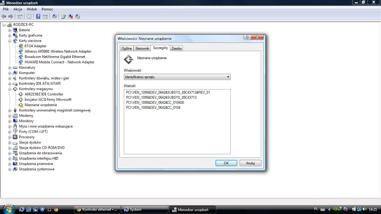 spokojnie ,wiemy już ,ze kontroler Ethernet został zainstalowany pomyślnie ,teraz wejdź w Menadżera Urzadzeń ,najedź kursorem myszki na 6T04 Adapter - ppm myszki -Właściwości -> szczegóły-> z listy : Włąściwość wybierasz -> Identyfikatory sprzętu - wynik dajesz na forum