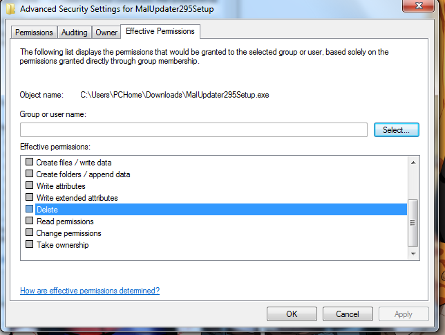 Próbowałem również w trybie awaryjnym lecz to samo, jak widać na załączonych ss-ach nie ma tutaj żadnych praw do tego pliku, nadać też ich nie mogę.