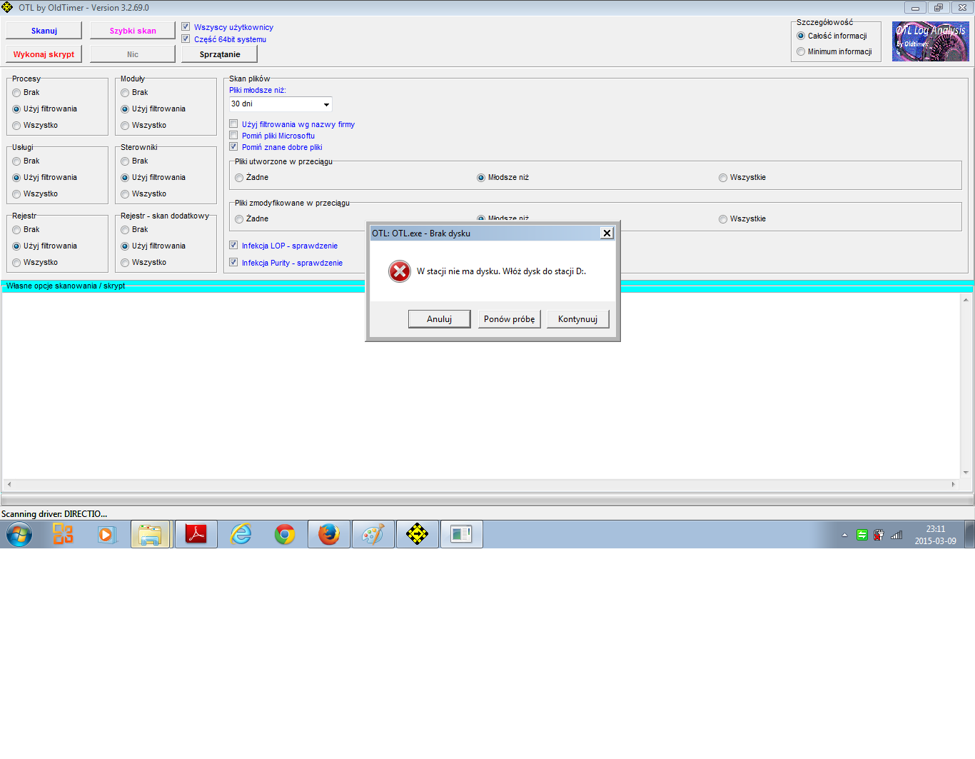 podczas skanowania programem GMER i OTL co chwile podczas skanowania wyskakiwał komunikat "Brak dysku. W stacji nie ma dysku. Włóż dysk do stacji D"