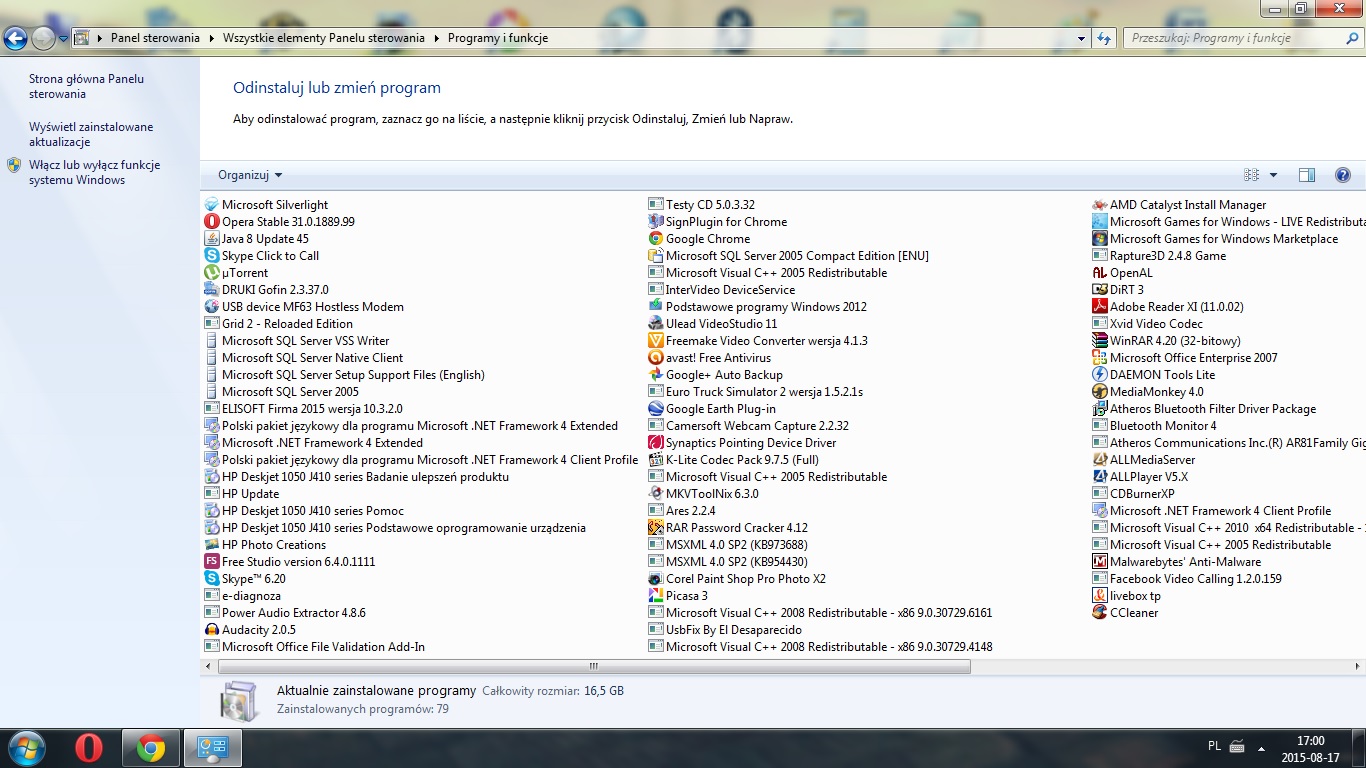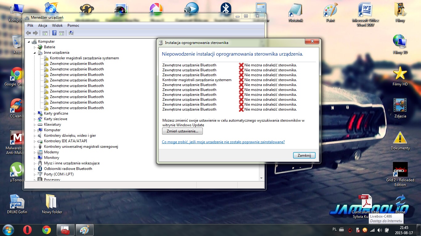 W Menedżerze urządzeń masz bardzo dużo żółtych wykrzykników - trzeba je wszystkie zlikwidować.