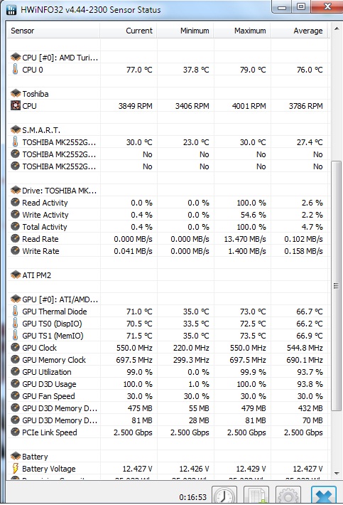 Obciążyłem procesor i grafikę, włączając: Prime95, Video Card Stability i film w HD 1080p. Temperatury po 15min testu HWiNFO.