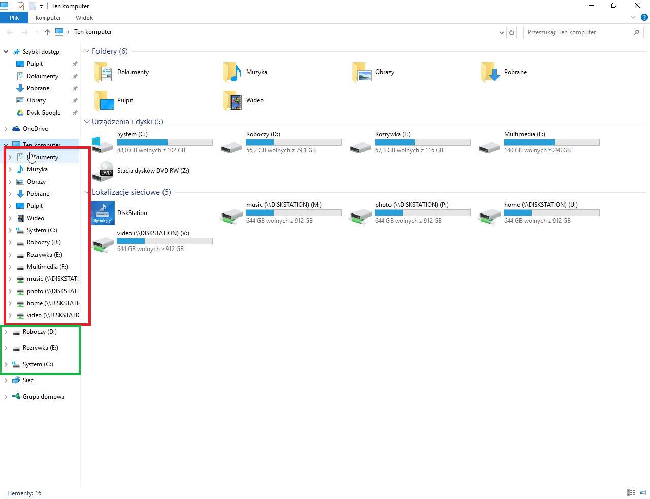 Chodzi o to, że w drzewie katalogu jest pozycja Ten komputer - i tam pokazuje ładnie wszystkie dyski (zaznaczone na czerwono rozwinięty "Ten komputer"). Ale część z nich, 3 z 4 jest dodatkowo powtórzona pod "ten komputer" (zaznaczone na zielono) - jako osobne wpisy. Na innych komputerach gdzie instalowałem win 10 tego nie ma. Chciałbym je zlikwidować. Raz że są niepotrzebne mi podwójnie - tu i w "Ten komputer" a dwa - najbardziej eksploatowanego dysku tam nie ma.