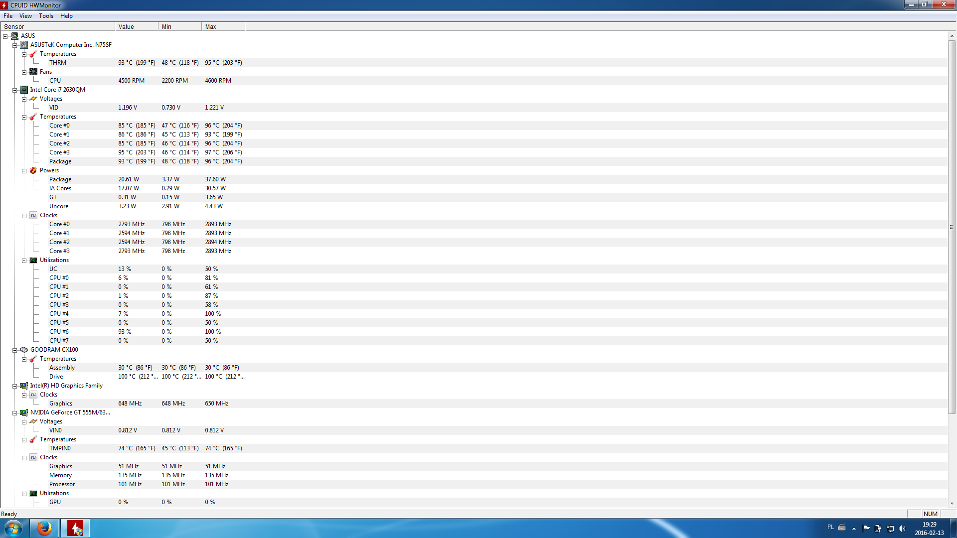 po kilku minutach od uruchomienia systemu temperatura procesora i karty graficznej wzrasta (do 100 stopni C i prawdopodobnie wyżej lecz tego nie sprawdzam). Wraz ze wzrostem temperatury wentylator zaczyna chodzić głośniej. Zasilacz nie jest gorący (normalna temperatura). Laptop od spodu jest gorący (prawdopodobnie w miejscu procesora, nie mogę zdjąć obudowy, gdyż 3 śrubki "wyrobiły się" - jak będzie taka potrzeba to spróbuję).