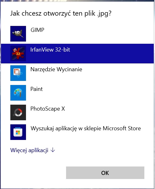 - Nie można zmienić -> otwórz za pomocą - zawsze używaj tej aplikacji, można tylko otworzyć w irfanview jednorazowo.